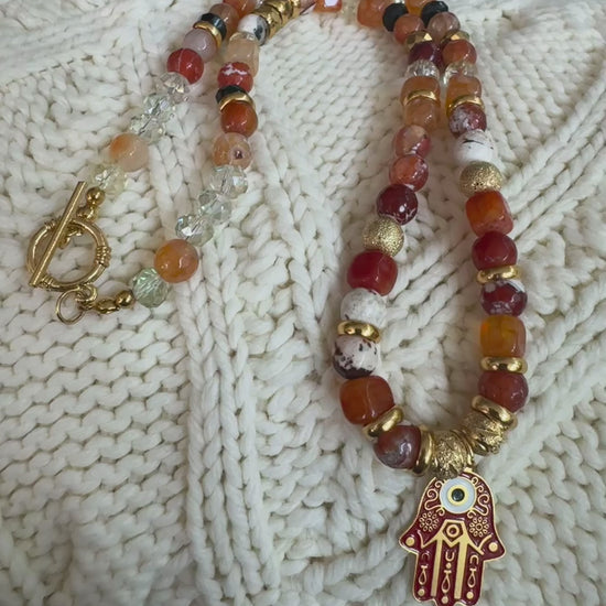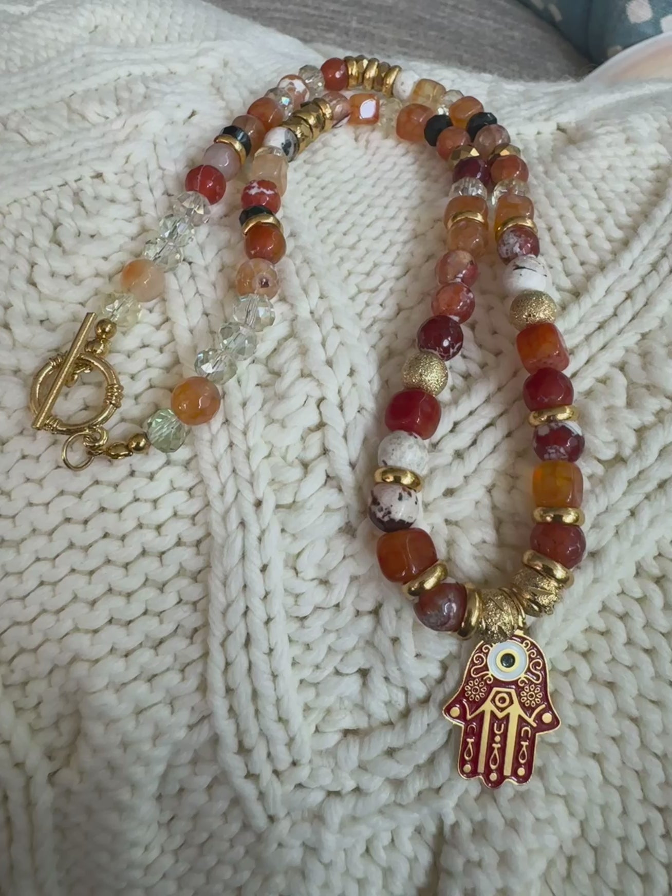 "Guardian Charm" is a powerful symbol of protection and good fortune. Featuring the Hamsa hand and the Turkish evil eye, this necklace is designed to ward off negativity and invite positive energy into your life. A perfect piece for those who believe in spiritual strength and personal style.